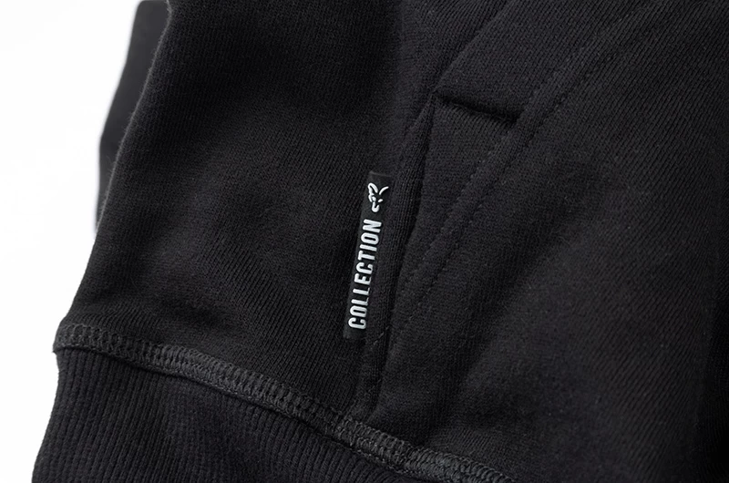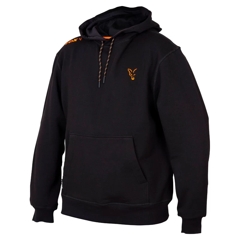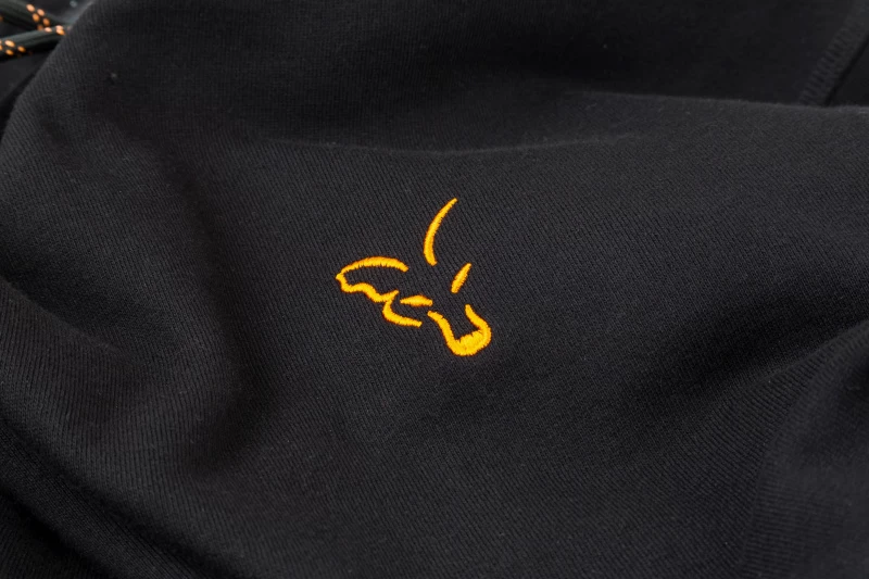 Een zwarte hoody met een oranje geborduurd Fox logo.