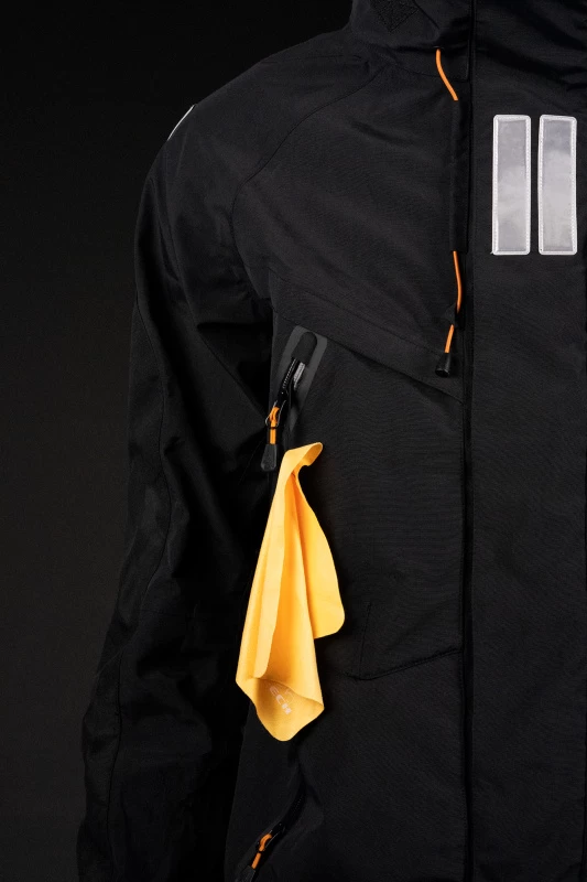 Waterdichte jas Duurzame 3-laags offshore set ontworpen voor ruwe omstandigheden. Zonder voering voor meer flexibiliteit. Een technisch geavanceerde ademende (WP 15 000 / MVP 15 000) wind- en waterdichte jas met getapete naden.
