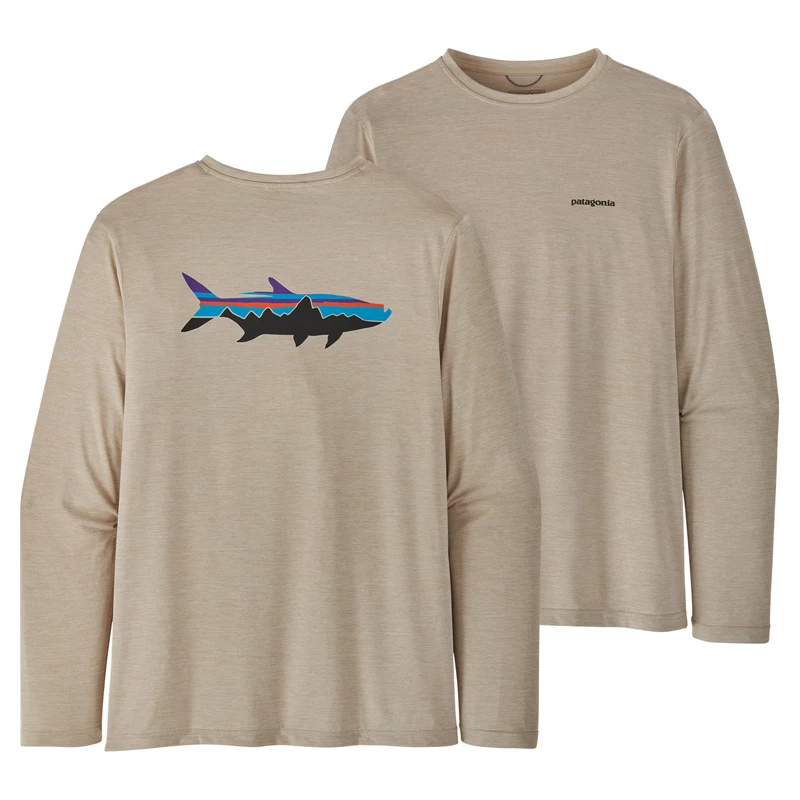 Het Capilene Cool Daily Fish Graphic Shirt met lange mouwen combineert een comfortabele T-shirt pasvorm met een ultralichte, sneldrogende 100% gerecyclede polyester stof die 50+ UPF bescherming biedt en Polygiene® permanente geurcontrole; de originele op vissen geïnspireerde graphics herinneren je eraan waar je ware interesses liggen.