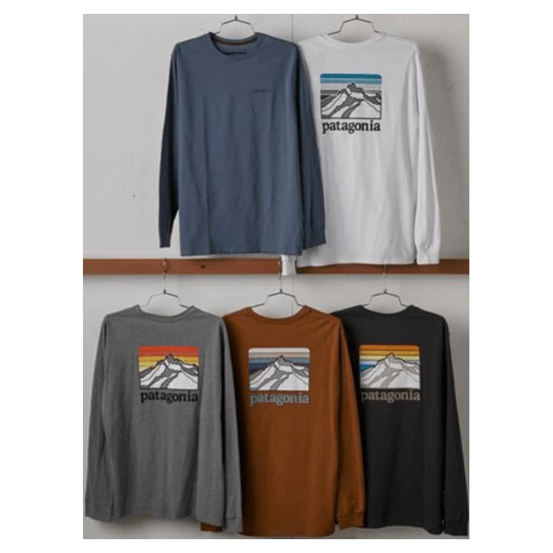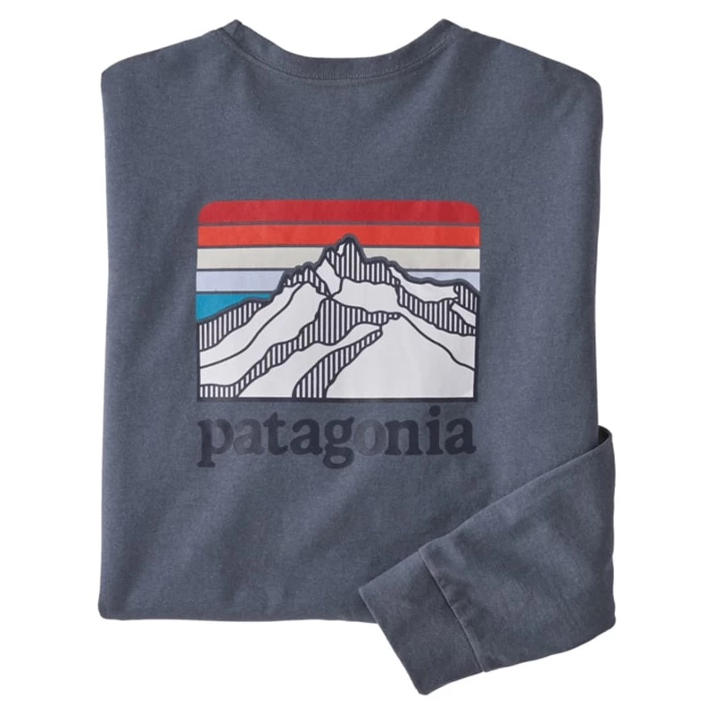 Patagonia M’s L/S Line Logo Ridge Responsibili-Tee Plume Grey, de productie van dit 100% gerecyclede T-shirt met lange mouwen gebruikt 96% minder water en creëert 45% minder CO2 dan een conventioneel katoenen T-shirt.