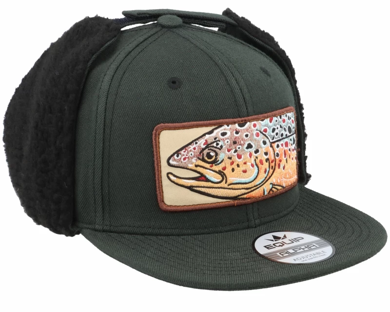 Echt leuke oorflap muts van Skillfish met een forel patch.